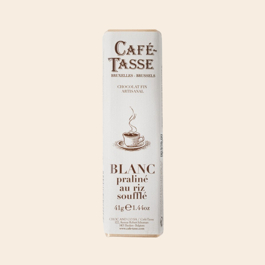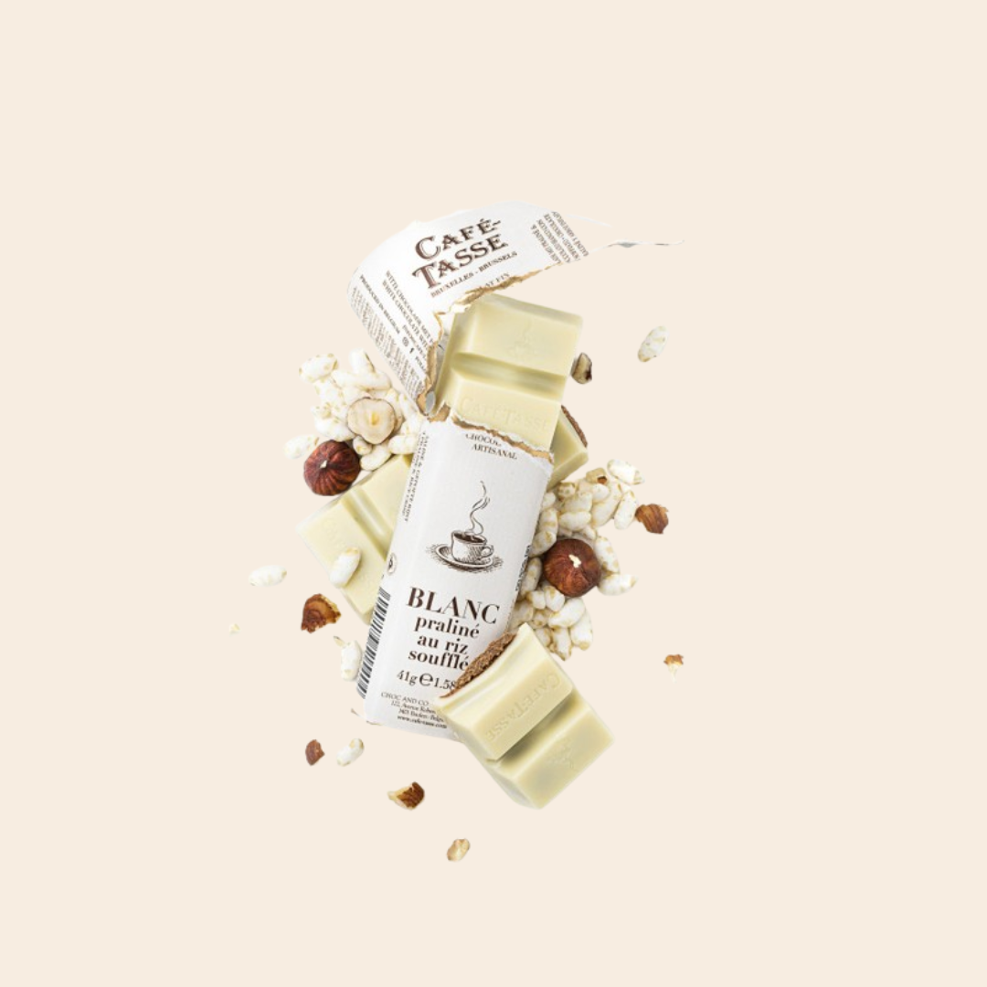 Laissez-vous séduire par la douceur d'un chocolat blanc crémeux associé à un praliné fondant et au croustillant du riz soufflé. Cette barre Café-Tasse offre un délicieux contraste de textures et une gourmandise irrésistible à chaque bouchée.