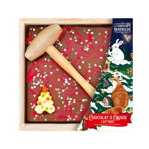 Chocolat au lait, décor à base de beurre de cacao coloré avec décor en chocolat et étoiles en sucre