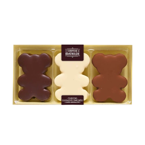 Craquez pour le Coffret de 3 Oursons Guimauves enrobés de Chocolat Noir, Lait et Blanc du Comptoir de Mathilde : un trio gourmand et réconfortant à offrir ou à savourer.